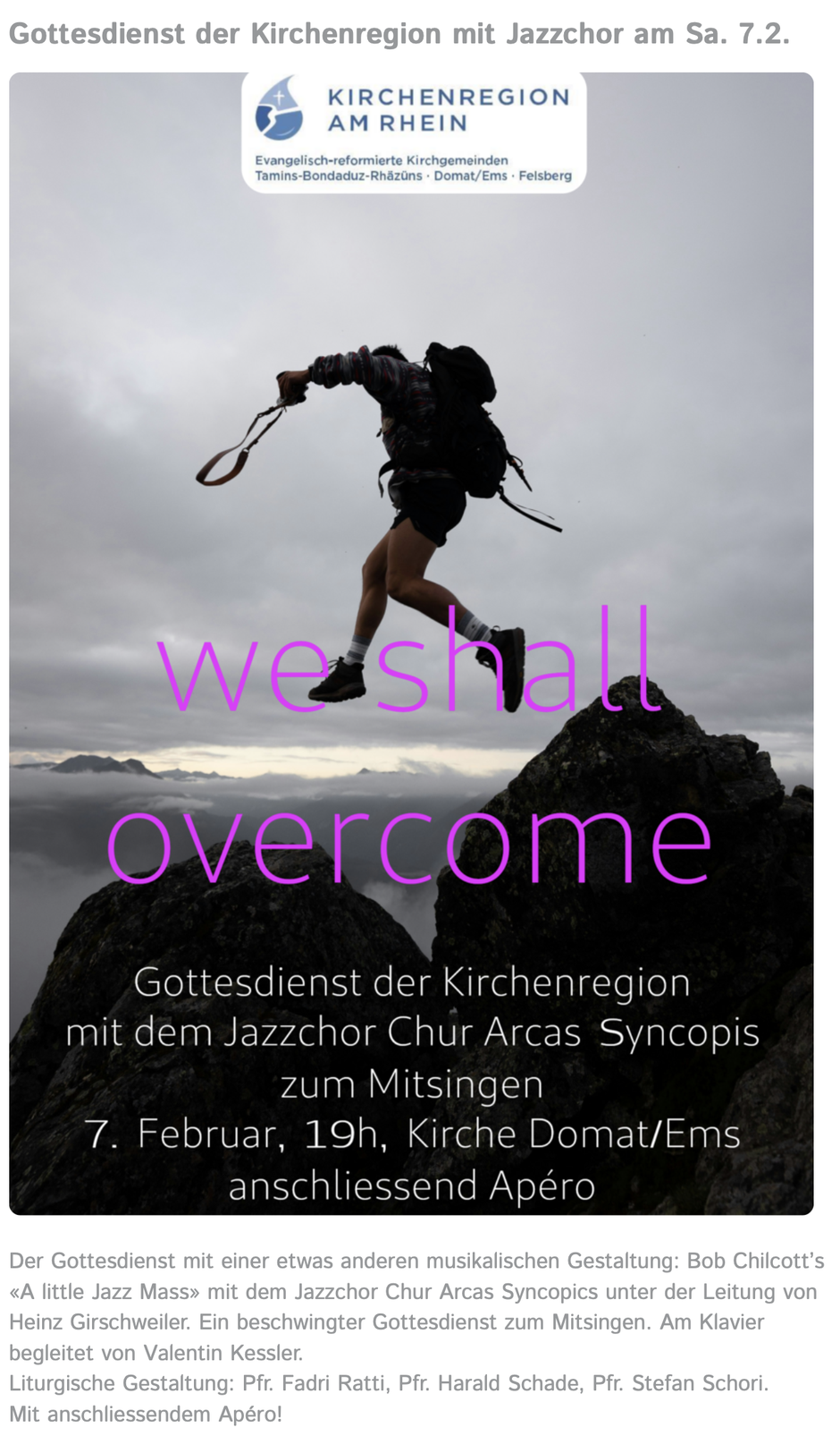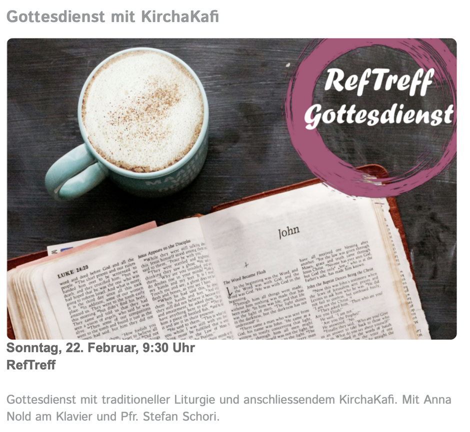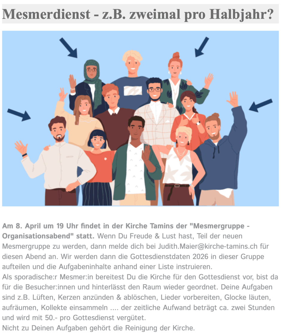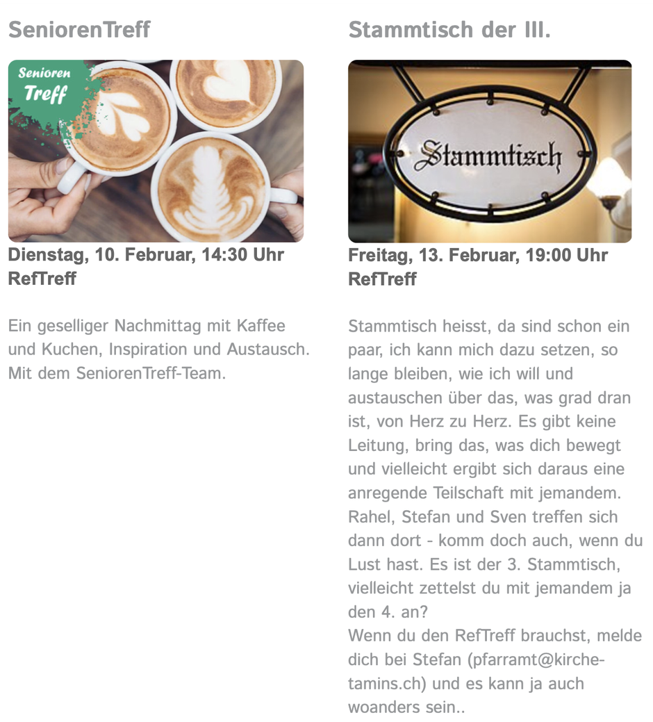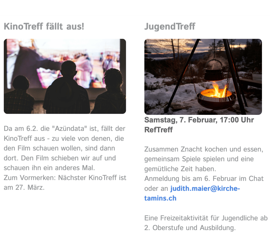 Ca. 1 x monatlich informiert die Kirche Tamins-Bonaduz-Rhäzüns ihre Mitglieder über Highlights und gibt Updates zu Laufendem. Der KirchaLetter verbindet in einer Zeit, in der nicht immer alle zur gleichen Zeit am gleichen Ort sind und sich trotzdem zugehörig fühlen. Der NewsLetter wird per Mail verschickt - registrieren Sie Ihre E-Mail-Adresse einfach online. Die Abmeldung ist jederzeit per Knopfdruck wieder möglich.
